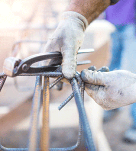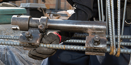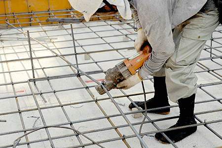 「ハッカー」と呼ばれる工具と結束線を使って、鉄筋の交差部を縛る作業です。しっかりと結束することによって、骨組みの強度が増します。