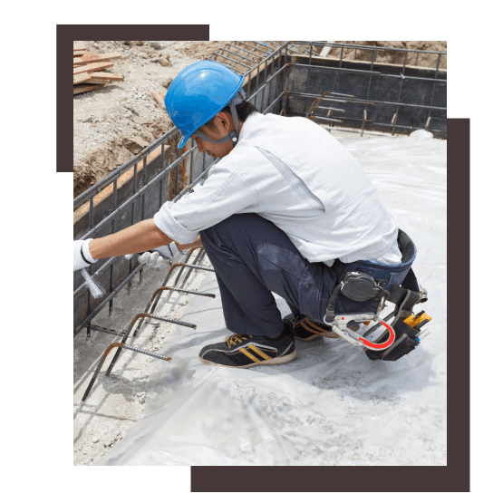 コンクリート基礎の内側には必ず鉄筋が使用されます。鉄筋工の大切な仕事のひとつです。